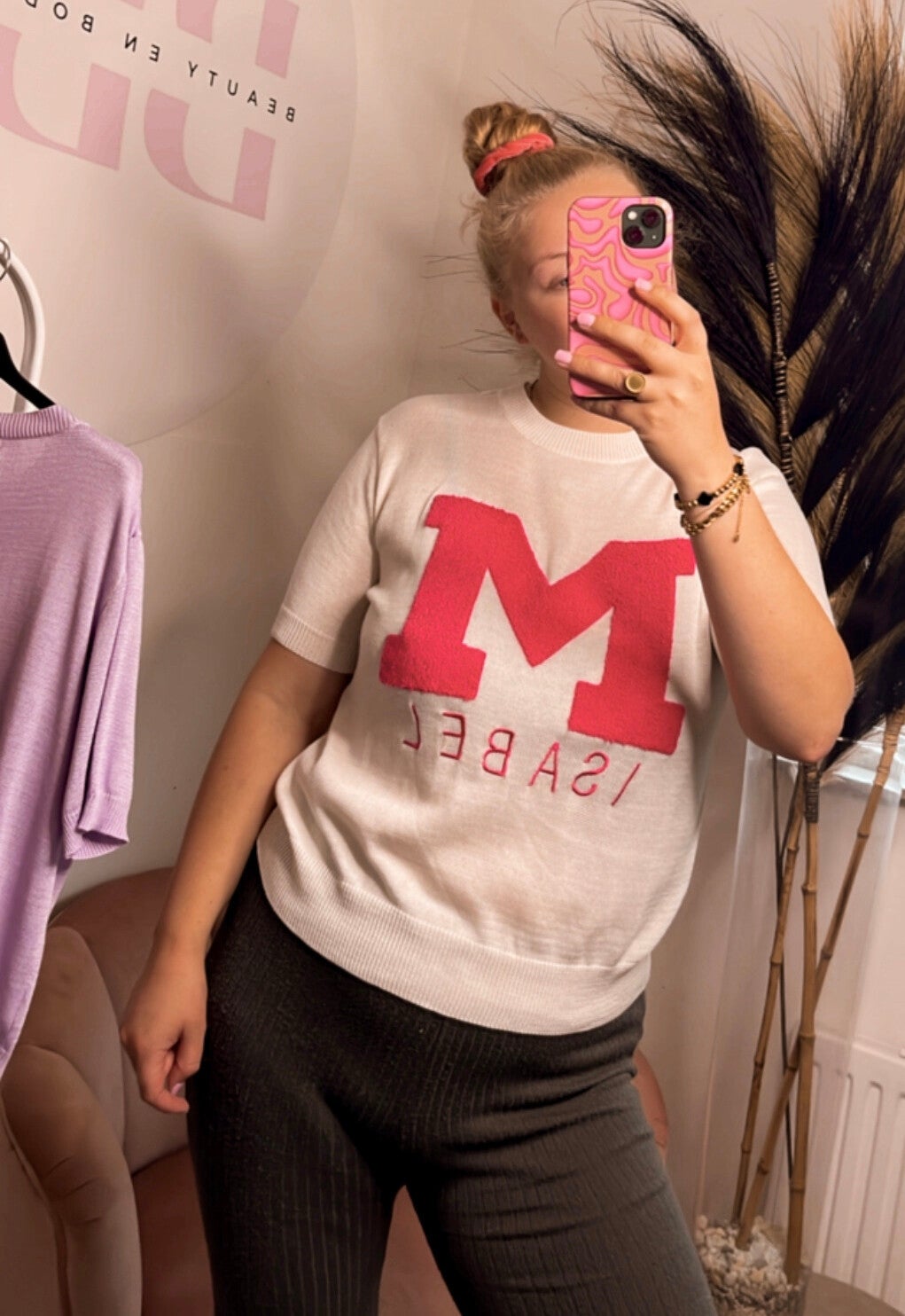 Gebreide iets glanzende top met trendy applicatie. Deze top is one size goed t/m maat 40/42.